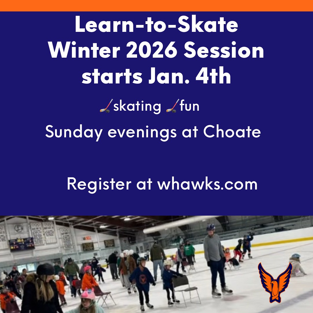 Learn to skate is a FREE 4 week program for ages 3-14. Parents/Guardians are allowed to skate with their children. Come join current Hawks coaches and players for fun filled Sunday afternoon skating at Choate!